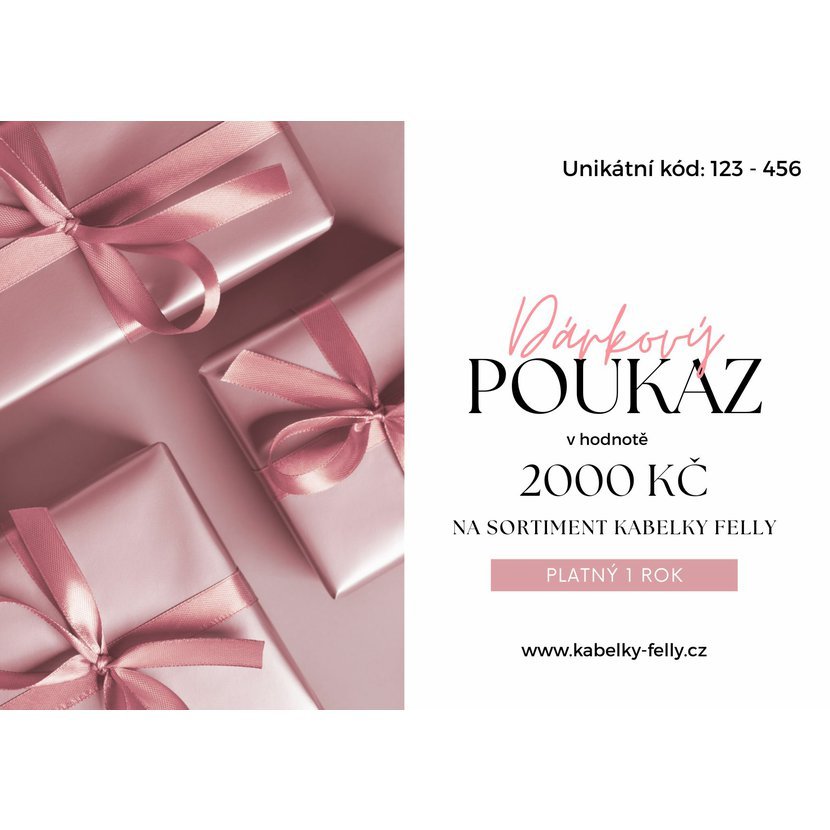 Dárkový poukaz v hodnotě 2000 Kč, který lze po zakoupení uplatnit po dobu 12 měsíců, jednoduše přidáním v košíku. Hodnota kuponu se odečte od hodnoty zboží v košíku. Minimální hodnoty objednávky musí být rovna nebo vyšší než hodnota kupónu.