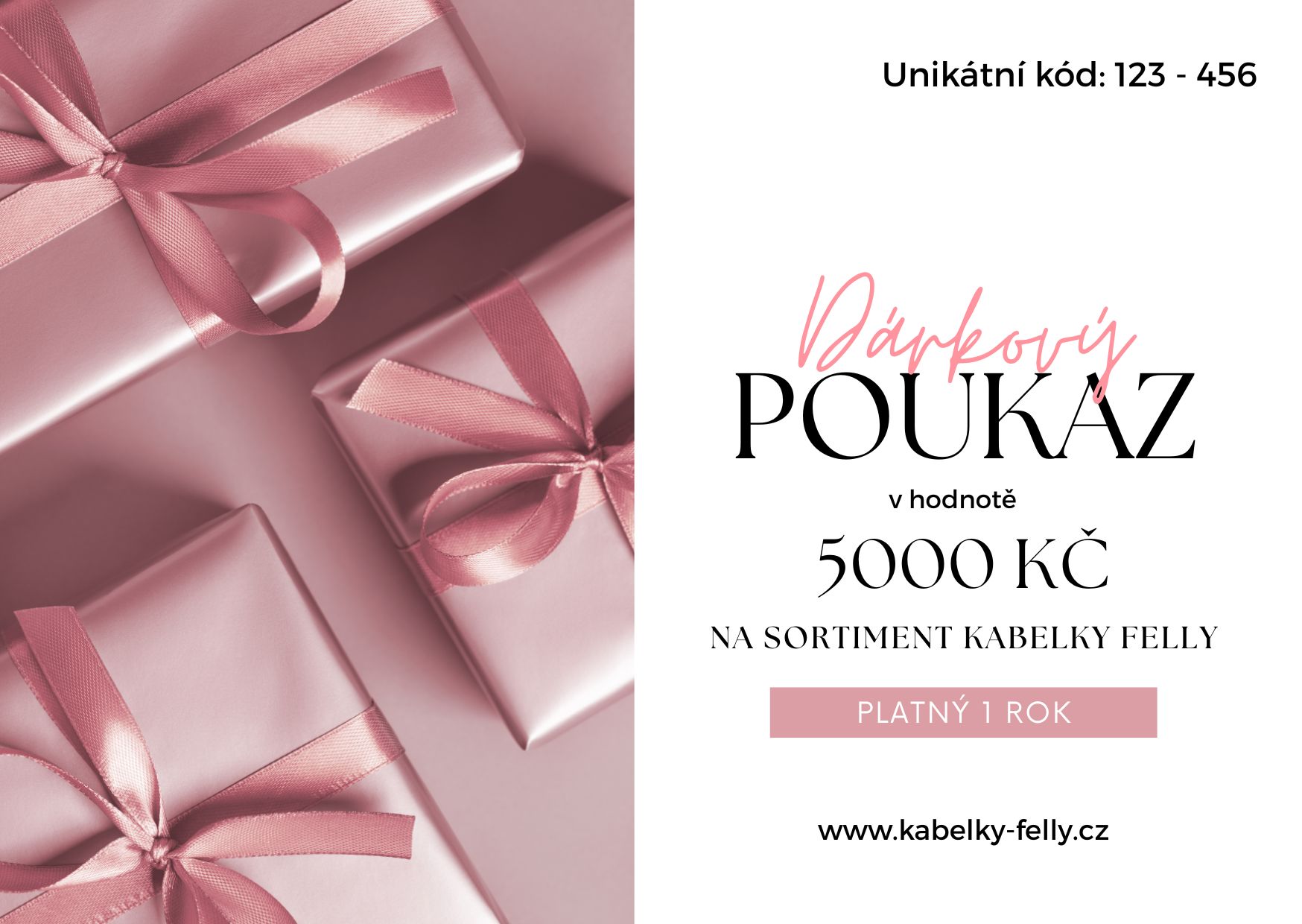 Dárkový poukaz v hodnotě 5000 Kč, který lze po zakoupení uplatnit po dobu 12 měsíců, jednoduše přidáním v košíku. Hodnota kuponu se odečte od hodnoty zboží v košíku. Minimální hodnoty objednávky musí být rovna nebo vyšší než hodnota kupónu.