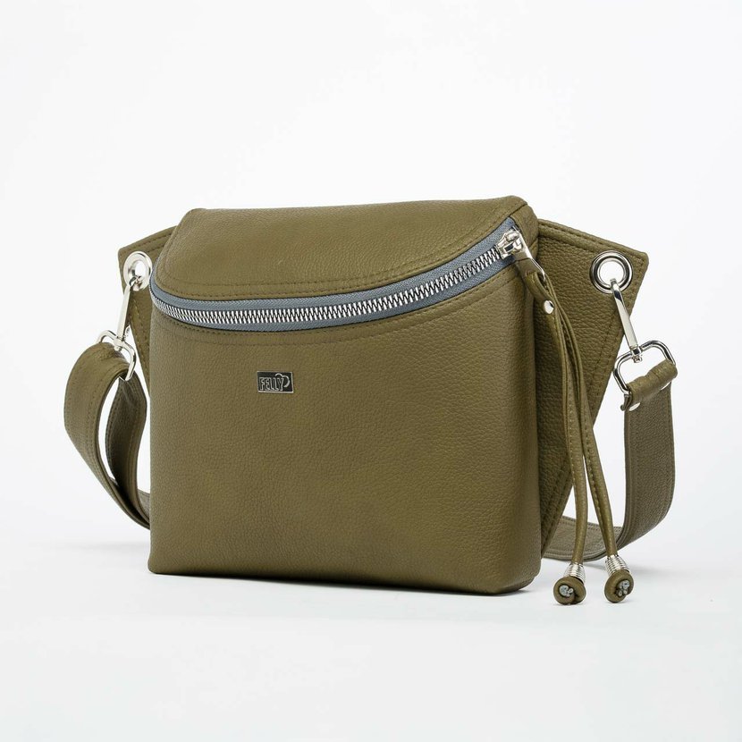 Ledvinka SALOME má široky, pohodlně sedící popruh, který se zapíná/odepíná na obou stranách karabinami. Zavírá se kostěným zipem se stříbrnými zoubky. Jezdec je doplněn o šňůrky, které kabelku zdobí a zároveň zpohodlňují otevírání a zavírání.
